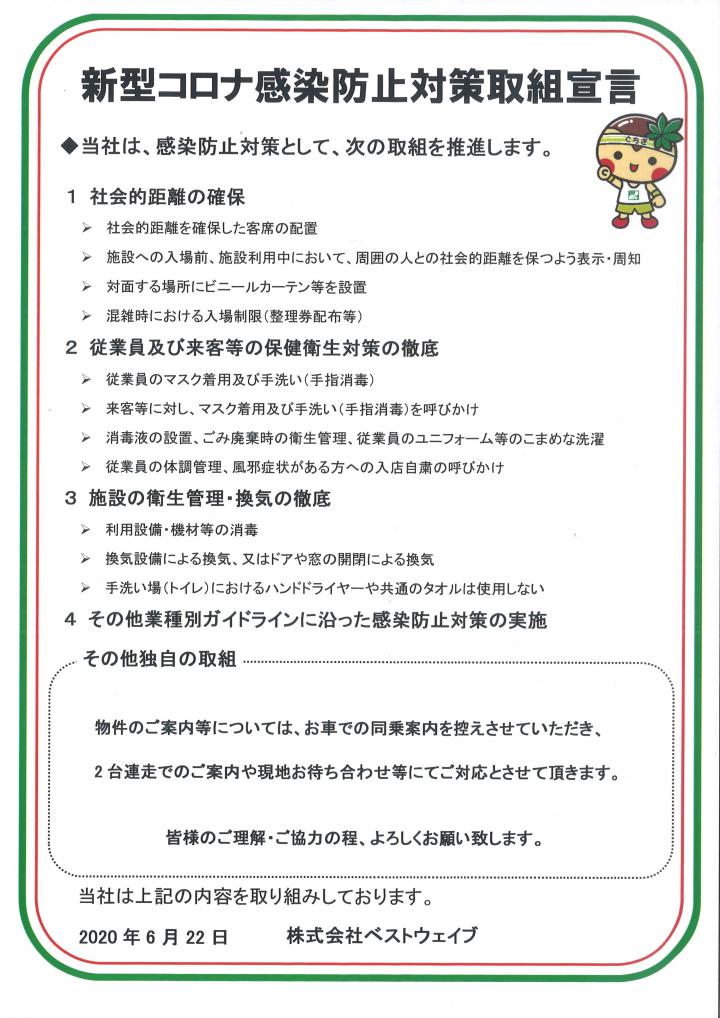 当社では新型コロナ感染防止にしっかりと対策を取り、健全な経済活動を続けて参ります。 新型コロナ感染防止対策取組み宣言の内容については添付の宣言書をご参照ください。