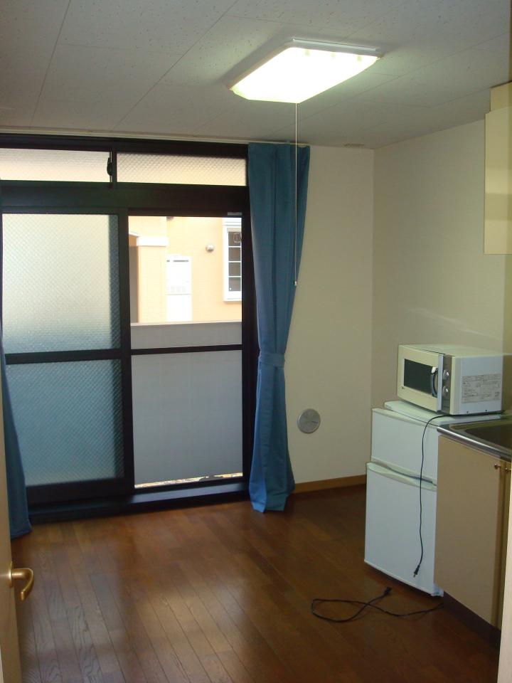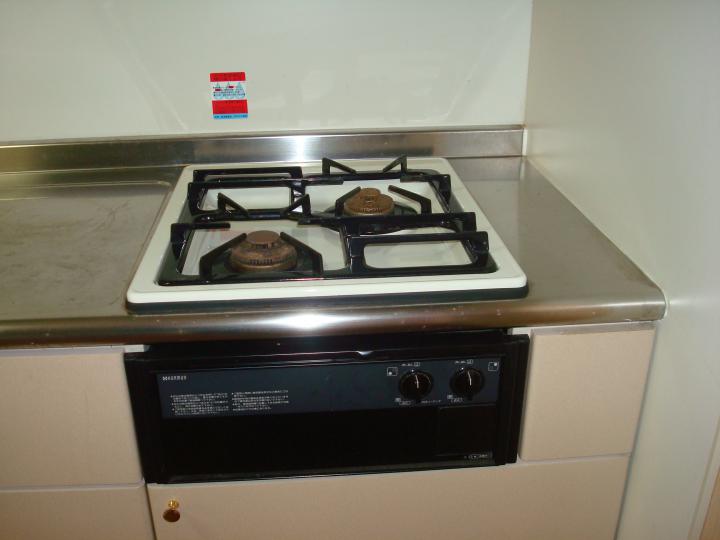 都市ガス物件、洗濯機・冷蔵庫・電子レンジ・エアコン・カーテン・テーブル、2口ガスコンロ付、