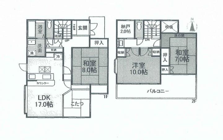 【 一戸建て 】オール電化戸建賃貸住宅。LDKに掘りごたつ式小上がりの畳コーナー、納戸、玄関吹き抜け、対面カウンターキッチン、IHクッキングヒーター、2F10帖洋室は2部屋に仕切ることもできる間取りです。