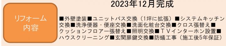 【リフォーム内容】 外壁塗装、ユニットバス交換(1坪に拡張)、システムキッチン交換、洗浄便器・便座交換、洗面化粧台交換、クロス張替え 、クッションフロアー張替え、照明交換、TVインターホン設置、ハウスクリーニング、玄関扉鍵交換、防蟻工事(施工後5年保証)